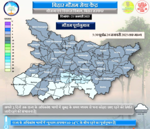 मौसम विज्ञान केंद्र के अनुसार, पूर्वी चंपारण, सीतामढ़ी, शिवहर, मुजफ्फरपुर, समस्तीपुर, सहरसा, मधेपुरा, दरभंगा, मधुबनी, सुपौल, अररिया, पूर्णिया, किशनगंज और कटिहार जिले में घना कोहरा छाए रहने की प्रबल संभावना है। दूसरी तरफ़, आरा और आसपसस के क्षेत्र में बादल छाए रहने का प्रभाव दिख रहा है। मौसम वैज्ञानिक का कहना है कि 22 जनवरी एक पश्चिमी विक्षोभ आने वाला है। इससे ठंड और बढ़ सकती है। दो दिनों तक आरा, पटना समेत कई इलाकों में अहले सुबह घना कोहरा छाया रहेगा। ठंड से भी राहत मिलने की संभावना नहीं है। 24 जनवरी के बाद न्यूनतम तापमान में दो से चार डिग्री सेल्सियस तक बढ़ोतरी हो सकती है। लोगों से अपील है कि वो ठंड को लेकर सावधानी बरतें।