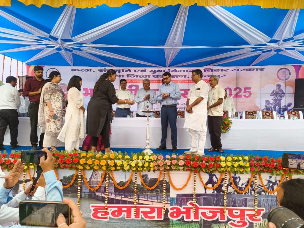 उद्घाटन डीएम तनय सुल्तानिया, डीडीसी डॉ अनुपमा सिंह, सदर एसडीओ रश्मि सिन्हा, वरीय उपसमाहर्ता हिना, जिला भू-अर्जन पदाधिकारी सत्य प्रकाश, जिला कल्याण पदाधिकारी नृपेंद्र कुमार निराला, कला एवं संस्कृति पदाधिकारी अनुप्रिया, सूचना एवं जनसंपर्क पदाधिकारी नीतीश कुमार, जिला सांख्यिकी पदाधिकारी मदन नारायण सिंह और जदयू जिलाध्यक्ष संजय सिंह ने दीप प्रज्वलित कर किया। अतिथियों को सिक्की कला से बनी कलाकृतियां देकर सम्मानित किया गया। सावित्री श्याम संगीत महाविद्यालय आरा की छात्राओं ने स्वागत गान “अंजुरी में फुल बा” गाकर अतिथि और दर्शकों का स्वागत कीं। इसके बाद डीएम और अतिथियों ने भोजपुरी भाषा, संस्कृति और खानपान से जुड़े स्टॉल का निरीक्षण किया।