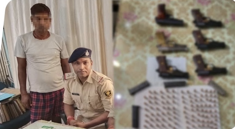 Crime News: पटना एसटीएफ और भोजपुर के अजीमाबाद थाने पुलिस ने बुधवार को अजीमाबाद थाना क्षेत्र के कमरिया गांव से छह देसी पिस्टल और 150 गोलियों की बड़ी खेप के साथ कुख्यात हथियार तस्कर को गिरफ्तार किया है। गिरफ्तार तस्कर कमरियां गांव निवासी काशी महतो उर्फ काशीनाथ सिंह का पुत्र अमन उर्फ राजकुमार उर्फ राज कपूर है।