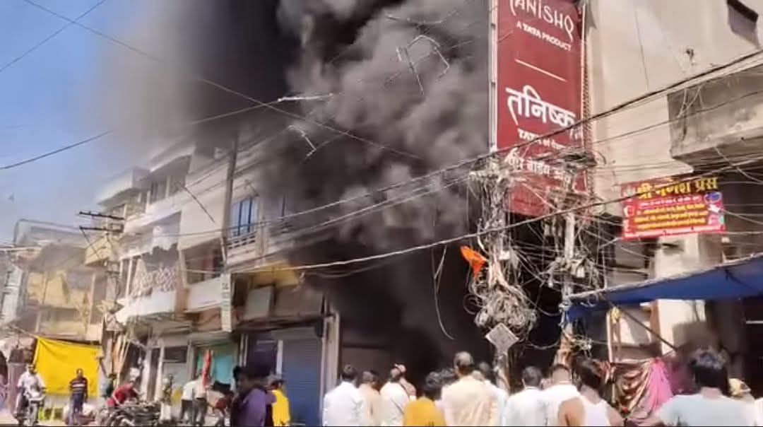 Fire breaks out in Tanishq Showroom: मंगलवार की दोपहर शहर के मुख्य बाज़ार में स्थित तनिष्क शोरूम में भीषण आग लग गई। आग शोरूम के बेसमेंट में लगी थी। क़यास लगाया जा रहा है कि गार्ड के बैठने के लिए चेयर स्टैंड बनाया जा रहा था, उसकी वेल्डिंग से निकली चिंगारी से आग लगी। हालाँकि, कारण स्पष्ट नहीं है।