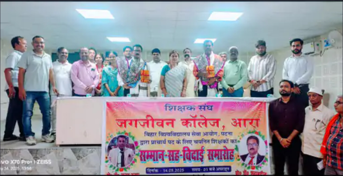 Jagjiwan College: जगजीवन कॉलेज परिसर में बुधवार को शिक्षक संघ द्वारा सम्मान-सह-विदाई समारोह का आयोजन किया गया। यह कार्यक्रम बिहार विश्वविद्यालय सेवा आयोग द्वारा प्राचार्य पद के लिए चयनित प्रोफेसर अजय कुमार और प्रोफेसर शहाबुद्दीन के सम्मान में हुआ।