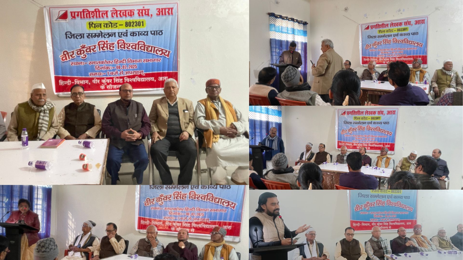 Kavi Sammelan: वीर कुंवर सिंह विश्वविद्यालय, हिंदी विभाग का सभागार शनिवार को एक से बढ़कर एक काव्य पाठों का गवाह बना। वक्त था प्रगतिशील लेखक संघ(प्रलेस) के भोजपुर इकाई के गठन एवं ज़िला सम्मेलन का। इस अवसर पर भव्य काव्य गोष्ठी भी आयोजित की गई। आयोजन की अध्यक्षता बिहार प्रगतिशील लेखक संघ के महासचिव रवींद्र नाथ राय, जनवादी लेखक संघ (जलेस) के राज्याध्यक्ष प्रो नीरज सिंह व जन संस्कृति मंच (जसम) के राज्याध्यक्ष जितेंद्र कुमार एवं वीर कुंवर सिंह विश्वविद्यालय स्नातकोत्तर हिंदी विभाग के विभागाध्यक्ष प्रो मृत्युंजय कुमार सिंह ने संयुक्त रूप से की। मुख्य अतिथि राम तवक्या सिंह, भोजपुर हिंदी साहित्य सम्मेलन के अध्यक्ष प्रो बलिराज ठाकुर एवं भोजपुरी विभाग के विभागाध्यक्ष प्रो दिवाकर पांडेय रहे।
