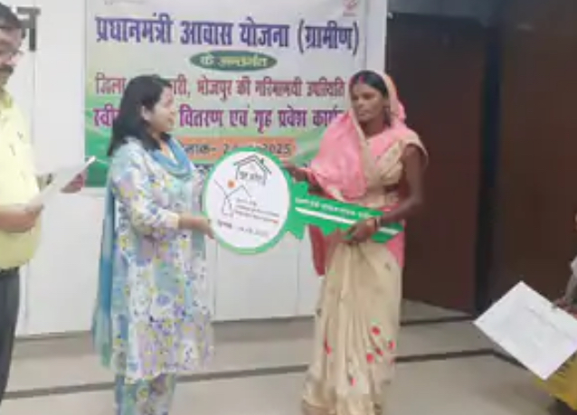 ग्रामीण विकास मंत्री श्रवण कुमार ने प्रधानमंत्री आवास योजना (ग्रामीण) के तहत राज्य भर के 75,269 लाभार्थियों के बीच प्रथम किस्त की राशि की स्वीकृति दी। उनके बैंक खातों में 301करोड़ 7 लाख 60 हजार रुपये की पहली किस्त ट्रांसफर की गई। अब तक भोजपुर जिले के अलग-अलग प्रखंडों में चालू वित्तीय वर्ष 2024-25 में लगभग 21 हजार लाभार्थियों को प्रधानमंत्री आवास योजना (ग्रामीण) का लाभ दिलाया गया है। समाहरणालय सभागार में प्रधानमंत्री आवास योजना ग्रामीण के लाभार्थियों के आवास पूर्ण होने पर चाभी सौंपी गई। इस दौरान डीडीसी डॉ. अनुपमा सिंह ने कोईलवर प्रखंड के पांच लाभुकों तोसमी देवी, लक्ष्मीना देवी, रविंद्र कुमार सिंह, शिवजी प्रसाद और राहुल प्रसाद को आवास की चाभी सौंपी। वहीं बड़हरा प्रखंड के पांच लाभुकों उषा देवी, मीरा देवी, मंजु देवी, केसरी कुंवर और पिंटू गिरी को स्वीकृति आदेश दिया गया।
