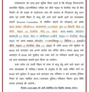Traffic Alert: ज़िले में जाम की समस्या से लोग त्रस्त है। बालू के ट्रकों से जाम की स्थिति भयावह हो जा रही है। ऐस में बिहार विद्यालय परीक्षा समिति की परीक्षाएँ भी आयोजित होने वाली है। आगामी 1 फरवरी से शुरू हो रहे इंटरमीडिएट परीक्षा और 17 फरवरी से मैट्रिक परीक्षा के दौरान जाम ना हो इसे लेकर ज़िला प्रशासन ने कुछ निर्णय लिए है। ज़िलाधिकारी तनय सुल्तानिया व एसपी मिस्टर राज ने बुधवार को मैट्रिक-इंटर परीक्षा में शहर समेत जिले में लगने वाले जाम की समस्या से निजात को लेकर अधिकारियों के साथ वीडियो कॉन्फ्रेंसिंग के माध्यम से समीक्षा बैठक की।